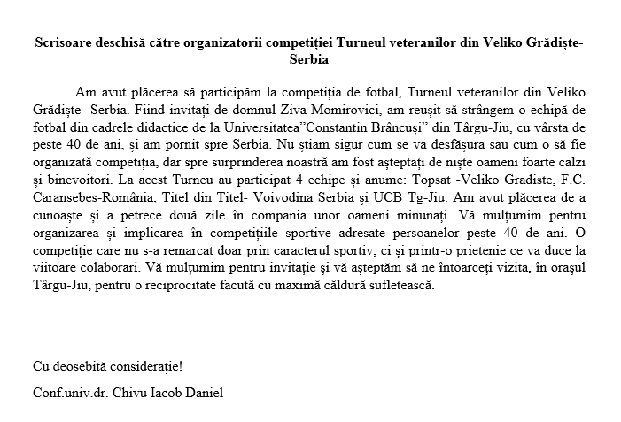 Turneul internațional al veteranilor desfășurat pe teren mic în sală la fotbal în Veliko Gradiste a fost organizat de clubul de fotbal TopSat- Veliko Gradiste și în colaborare cu Asociația „Românii Împreună” și biroul CIEI.
